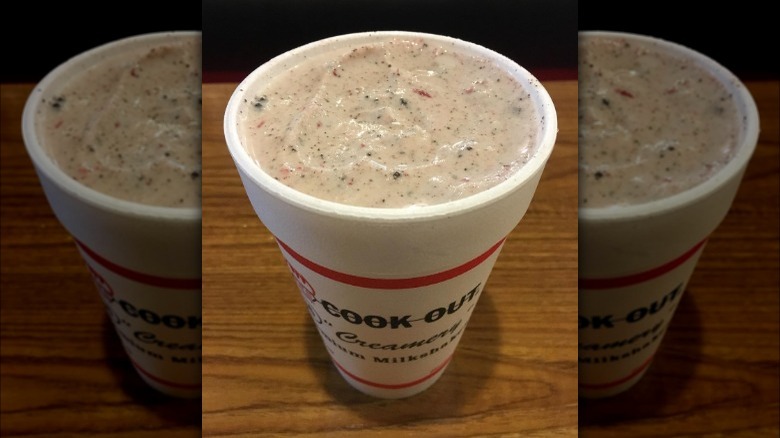 Come on, what could be better than an Oreo cookies n' cream milkshake? Cook Out doesn't skimp on mix-ins and is pretty heavy-handed when adding these cookies to a shake. It's an ideal amount of Oreo pieces as is, but if you're really in the mood for extra cookie action just ask to double up on them, because why not? Since Oreos crumble fairly easily, the texture of them in this shake is a mix between cookie dust particles and bigger bites of Oreos throughout. If you're lucky, they might throw in some larger pieces to scoop out when you're finished drinking the shake.