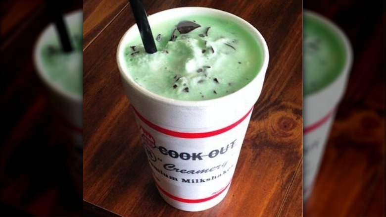 If Oreo Mint isn't your thing, rest assured that Cook Out also offers a Chocolate Chip Mint shake. It's just how it sounds: mint ice cream with chocolate chips that resemble flakes. Unless you are a hardcore fan of this classic ice cream flavor, you may just want to stick to the Oreo version. With the cookies, you can expect far more crunch and chocolatey goodness than with the chocolate chips. In a pinch, it's still a thirst-quenching option with a fair amount of sweetness with every sip. One way this shake could be improved is by adding fudge sauce to add a deeper chocolate taste, as the chocolate chips only go so far in this one.