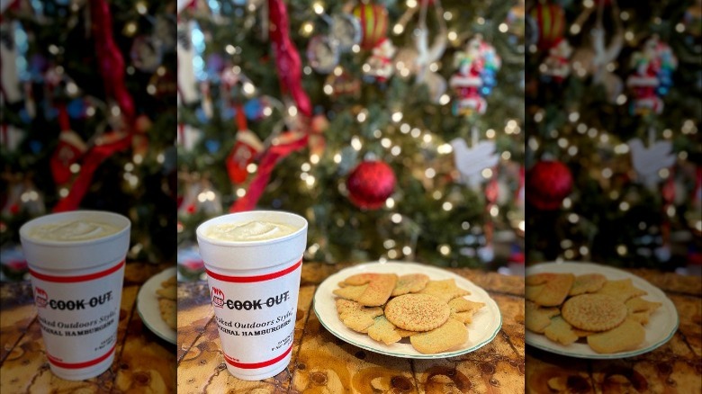 Cook Out's Eggnog shake is its holiday gift to customers. Eggnog has a pretty thick consistency thanks to the copious amounts of cream and egg yolks, but it's even denser in milkshake form. While you'll have to supply your own booze to make it the grown-up version of eggnog many know and love (please do so at home!), it's a seasonal sweet treat you can look forward to having as a milkshake. Eggnog effortlessly blends in with vanilla soft serve, so as soon as you take your first sip of this shake, you can immediately taste the cinnamon and nutmeg shining through. This shake maintains a super creamy texture, so instead of milk with your cookies, maybe opt for an Eggnog shake with them instead.
