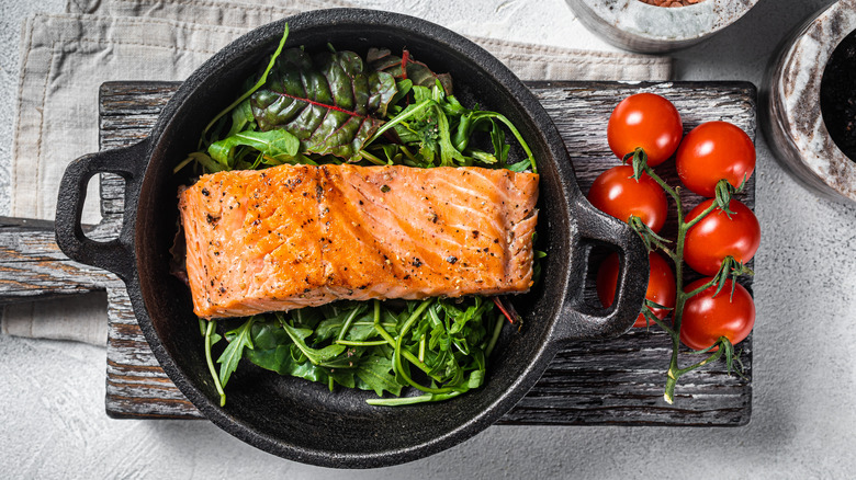If you happen to take the fish's temperature prior to it being done, that can cause the accidental release of some albumin, too. To fix this, pat the fish dry prior to putting it back into the oven. This way, that albumin won't leak out as it finishes cooking. Finally, make sure the fish is cooked to an internal temperature of no more than 120 to 125 degrees Fahrenheit. Overcooking salmon will only exacerbate the albumin issue.