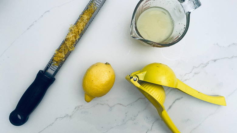 Meanwhile, turn your attention to the lemons. Zest three of them, then squeeze out all of the juice. You'll need ½ cup of lemon juice, so if three lemons don't quite yield that amount, go ahead and juice the fourth one.