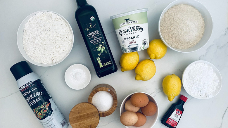 A key component to making this cake is lemons, and you'll need both zest and juice from three or four fresh ones. You'll also need flour, baking powder, salt, eggs, sugar, extra virgin olive oil, and plain yogurt to round out the cake. As for the glaze, you'll need powdered sugar, almond extract, and even more lemon juice.