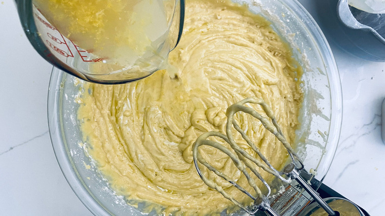 Combine the olive oil and yogurt in a measuring cup. Then, switch your mixer to low speed and add in a bit of the flour mixture, followed by a bit of the oil/yogurt mixture — keep alternating until both are incorporated. Be sure to start and end by adding the flour mixture. Finally, pour in the lemon juice/zest (be sure to reserve 3 tablespoons for the glaze), and beat on low until just combined. "Be sure to not overmix," Vergara advises.