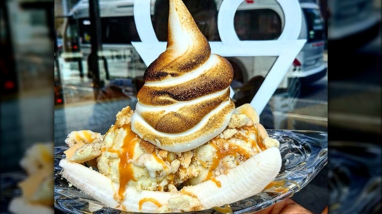 Louisville Cream's Banana Pudding Sundae comes with the company's signature Banana Pudding ice cream, a whole freshly-peeled banana, a generous drizzle of caramel, and a lightly-torched marshmallow topping. The caramel adds a buttery sweetness that perfectly pairs with the Banana Pudding Ice Cream. The torched marshmallow topping introduces a sweet and smoky fluffiness to the sundae that puts it over the top, nudging the treat into top-tier territory.