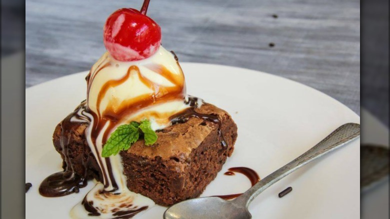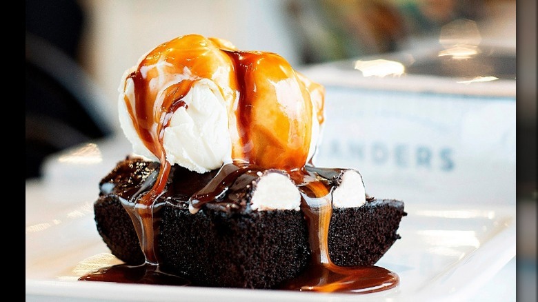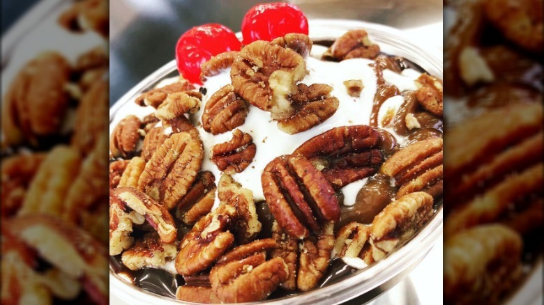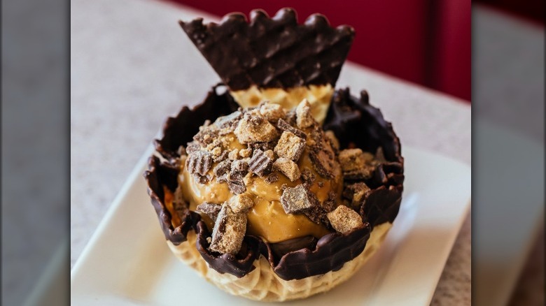 One of the best ice cream sundaes on the menu at Sanders is the Bumpy Bliss Sundae. The Bumpity Bliss Sundae comes with vanilla ice cream and gooey hot fudge on top of a chunky slice of chocolate fudge Bumpy Cake. Bumpy Cake is a Devil's food cake that comes capped with sticks of buttercream that are delicately wrapped in fudge icing. Brownie sundaes are delicious — but a Bumpy Cake sundae is even better. The logs of fudgy buttercream on top of the cake add a richness to the sundae that's pure heaven. Because this sundae features such a uniquely tasty ingredient like Bumpy Cake, it tops our list as one of the country's absolute best. Do yourself a favor if you're in the area in Michigan and swing by to give it a try.