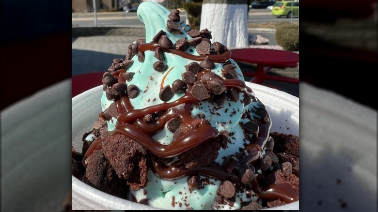 There's something special about mint chocolate chip ice cream. The cooling flavor of mint provides a delicious balance with the warming aroma of cocoa and the rich sweetness of chocolate. When mint chocolate chip ice cream is turned into a sundae with extra toppings, the flavors are even better — especially at Magnifico's. Magnifico's is an ice cream shop that's located in East Brunswick, New Jersey. The shop has a list of rotating flavors that includes German Chocolate, Oreo Cookie, and Toasted Coconut. The good news is that it also has a list of permanent flavors that are always available, including its Chocolate Chip Mint.