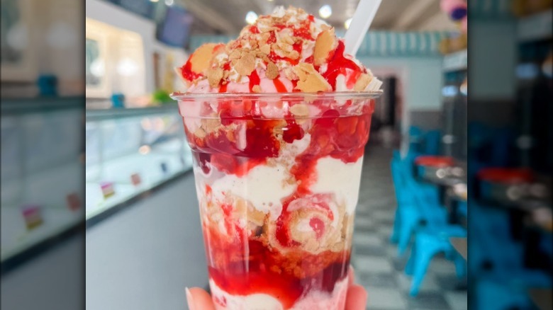 Strawberry shortcake is a truly classic treat. Juicy, sweet strawberries are layered on top of a delicate, spongey shortcake. Sometimes, biscuits are used instead of shortcake, which is equally delicious. Whipped cream is dolloped on top, which adds a velvety sweetness that pairs perfectly with the fruit and shortcake or biscuit. Turning strawberry shortcake into an ice cream sundae is a brilliant move, and Good Karma — an ice cream parlor in Easley, South Carolina — has a spin on this dessert that is absolutely scrumptious. One fan of Good Karma on Yelp says that the shop has, "Amazing ice cream. Abundance of flavors and toppings to choose from. Staff was very helpful."