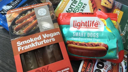 Field Roast makes two types of franks: Signature Stadium Dog Plant-Based Hot Dogs and Classic Smoked Plant-Based Frankfurters. The former contains: "Water, canola oil, pea protein, potato starch, methylcellulose, carrageenan, vital wheat gluten, brown rice protein, vinegar, faba bean protein, beet powder, sea salt, natural flavor, cane sugar, garlic powder, harwood smoked sugar, konjac flour, potassium chloride, onion powder, xanthan gum, black pepper, nutmeg, cherry powder, paprika."