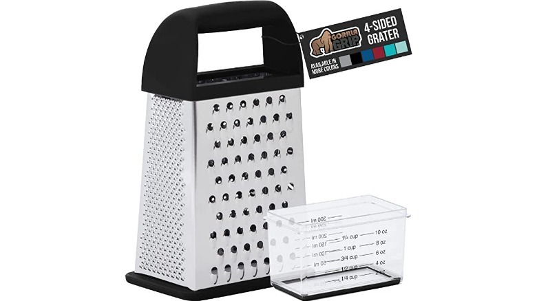 In addition to its sturdy construction, what we especially like about this item is that it has a container that attaches to the bottom to catch everything you're grating. Gorilla Grip went the extra mile to not only add a base to that base container to prevent it from slipping on your countertop, but also helpful measurements on the side to show you just how many cups, ounces, and milliliters you've accumulated.