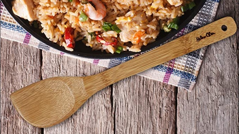 The ideal wooden spatula for stir frying has slightly sharp edges to scrape the ingredients around, and it's also smooth enough to not break those precious ingredients apart and keep them intact for presentation. And despite being made of wood, this spatula needs to hold up to the high heat. Helen's Asian Kitchen has all of that in mind with its thick wooden spatula that's made from bamboo.