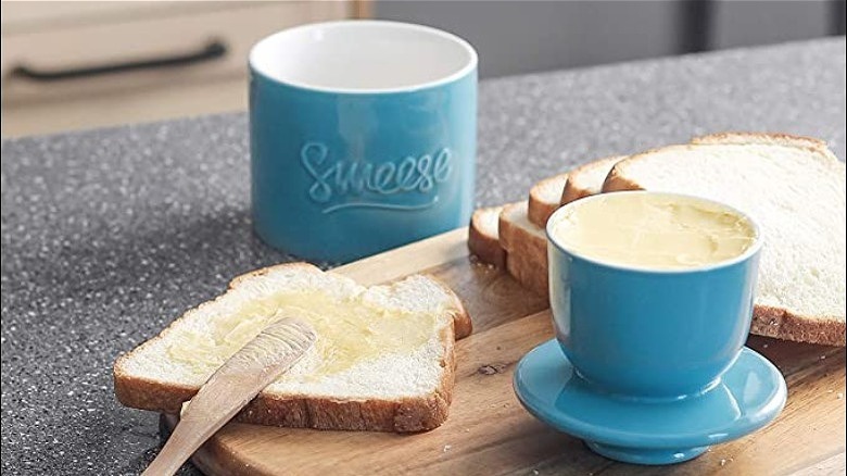 Chilly cold butter is extremely helpful in certain baking situations — notably pastry recipes that require a crispy, flaky texture like croissants and pie dough. But when all you want is add a dab to hot toast or an English muffin, you want that butter to be on the warmer side and ready to melt. And that's when a butter crock would deserve a spot on your kitchen counter.