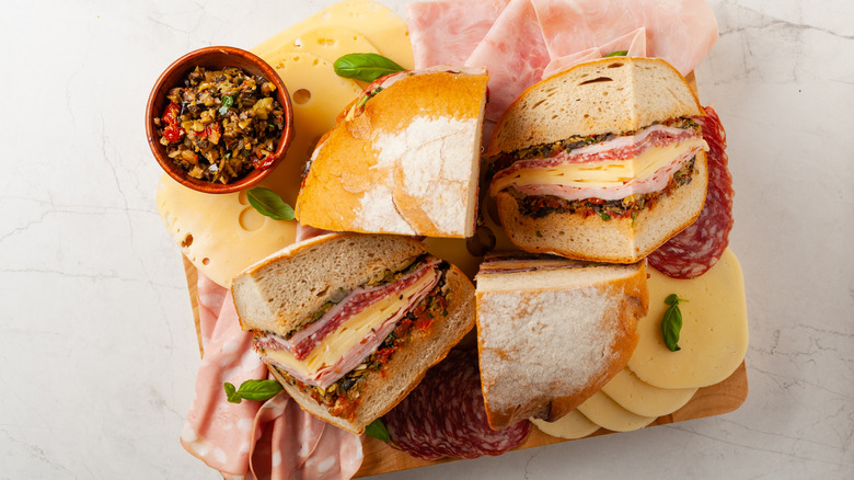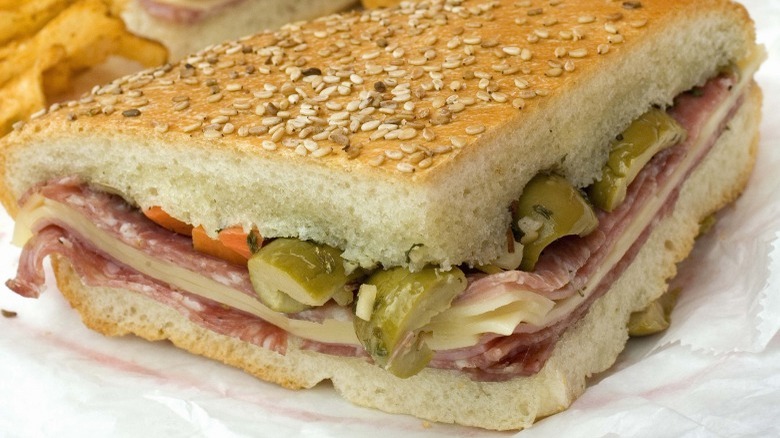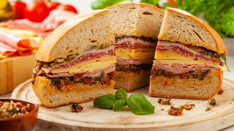 In addition to the po'boy, the muffuletta is an iconic New Orleans sandwich. It is salty and tangy, thanks to its unique olive-based condiment. It's also made with savory Italian meats and cheeses. All of this gets piled high on a large round loaf. It may seem fairly simple, but the sandwich is actually somewhat complex. Here's a deep dive into the New Orleans muffuletta.