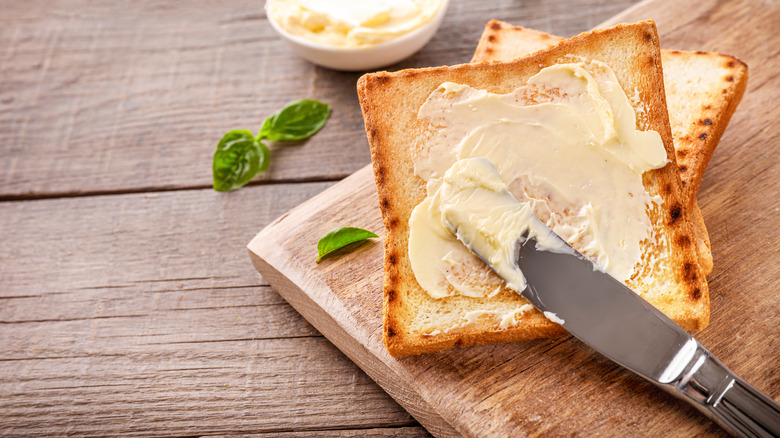 To get the absolute most out of this trick, the toaster can lend a hand by removing more moisture. Place your bread in the toaster and heat it till it's just getting crisp on the outside — no more than a few minutes. Next, let the bread cool completely before applying your layer of butter. Since the goal is to minimize moisture, you want a healthy layer of butter on both slices of bread. Any uncovered bread could get soggy before you know it.
