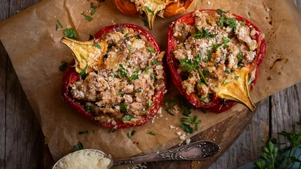 Stuffed peppers are a perfect at-home hearty meal that is also versatile. One of the most common ways of preparing them is stuffing the peppers with ground beef. However, you can swap that out for chicken or ground turkey or forego the meat altogether and opt for a vegetarian take with extra rice, mushrooms, and other veggies.