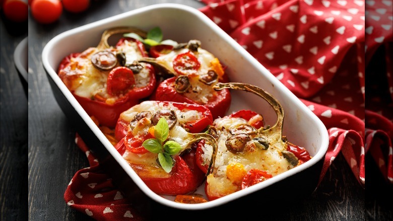 To best recapture that freshly-cooked taste, take the extra time to place leftover stuffed peppers in the oven. It does take longer than other methods, but reheating in the oven will help the peppers retain their texture and that outer crispiness. Plus, if the peppers were frozen, putting them in the oven allows them to cook through. Preheat the oven to 350 degrees, and place the peppers in a casserole dish with a lid or cover with aluminum foil. Make sure the peppers are spaced out when lining the dish. Do not stack them. Bake them for 15 to 20 minutes. Take the casserole dish out and remove the lid, then place the peppers back in the oven for five minutes to achieve a crispy finish. Check the internal temperature of the peppers, as it should be around 165 degrees.