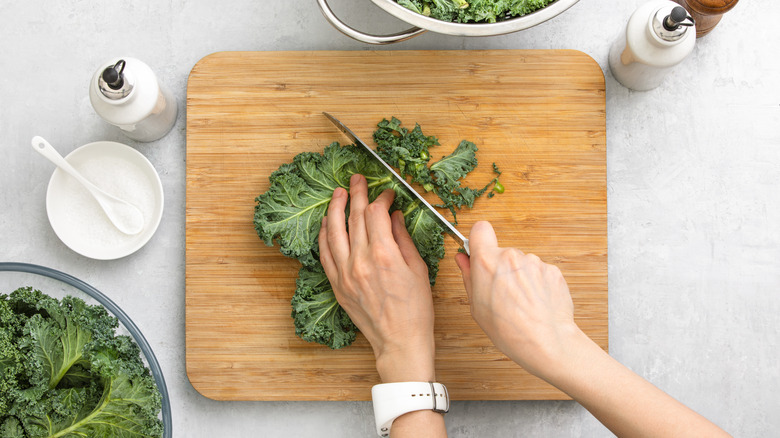 Because kale is rife with cellulose making it tough and woody, it can be hard to chew and take forever to break down, especially depending on the specific variety you are using. Cutting it into smaller pieces helps speed up the cooking process and will give it a more appealing mouthfeel when eating it raw. Depending on the specific application the kale is for, you may cut it into smaller or larger pieces. For braising or sautéeing, you can leave the kale in slightly larger chunks, as these will wilt down when heated. For salads, chop the kale finely, like a chiffonade, which gives it a more palatable texture.