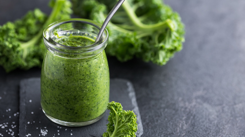 Pesto is a delectable verdant sauce originating in the northwestern Italian region of Liguria, specifically the town of Genoa. This sauce, whose name translates to "pound or crush," gets its moniker from how it's typically made — by pounding fresh basil, pine nuts, garlic, cheese, oil, and salt into a paste with a mortar and pestle. Today, pesto is more of a guideline than a recipe, with variations popping up with many different ingredients, including other herbs or greens, like kale.