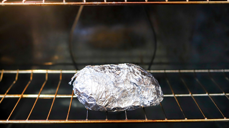 Getting the texture of the skin right is a whole other ordeal. Ideally, it should be crispy, but more often than not it turns out soggy instead. If this is a frequent occurrence when you make baked potatoes, chances are you're being foiled by a common mistake. While your first inclination might be to bake a potato in tin foil, that convenient, thin layer of metal might is spoiling your spuds.