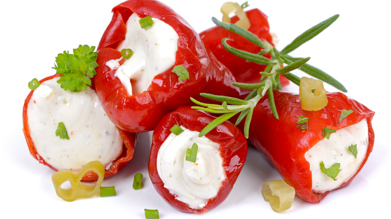 Interestingly, the cookbook author doesn't stop there. When preparing this unique filling, she also adds some fresh garlic, some olive oil, and a couple of banana peppers. Here, the buttery dairy flavors of the cream cheese help neutralize the pungency — not just of the feta, but also of the garlic, creating a blend that's more well-rounded. The olive oil further balances out the mixture, offsetting some of the acidity found in the feta and the banana peppers. Meanwhile, this last ingredient will add a distinctive peppery taste to the cheese mix. Ultimately, this will tie the taste of the creamy filling to the flavor of the larger pepper that you will stuff, creating a dish that is tasty and cohesive.