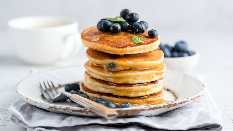 Luckily, Trisha Yearwood has some awesome tips to prevent this phenomenon from ruining your morning meal. As she explained in an episode of "Trisha's Southern Kitchen" (via YouTube), "If you've ever had, like, a sweet bread or a cake where all of the fruit is at the bottom, it's because the fruit has nothing to hold on to ... so, if you cover the blueberries in flour, they'll evenly cook in the cake and they'll distribute themselves evenly." To use Yearwood's advice, fill a bowl with flour and mix your berries or chopped fruit into it. Once a thick white coat of flour has formed over the top, add it into your pancake batter and make perfect fruity flapjacks.
