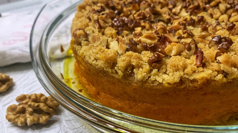 Instead, Yearwood suggests making a sweet and savory topping, using a combination of chopped nuts, butter, brown sugar, and flour. To take a page out of the television host's book, just whip up your typical sweet potato soufflé and then sprinkle a thick layer of her special chopped nut blend over the top. This will give you a side that provides more texture than you would normally get from your typical gooey layer of marshmallows. As Yearwood explained on her show (via YouTube), "This just gets crunchy and sweeter and sweeter as it cooks."