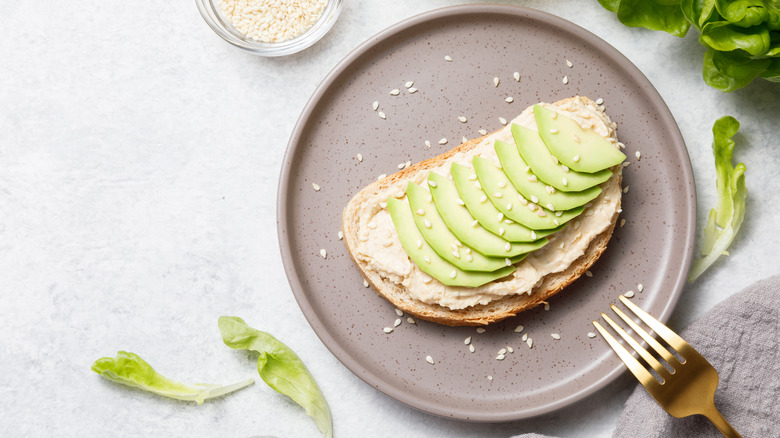 That's right, the rich,thick dip that you usually see alongside pita chips at parties is also the best way to get avocado toast that is tasty and super creamy. On top of having a texture that's perfect for spreading between toast and avo, hummus provides an extra boost of protein. Don't forget that it comes in a variety of flavors to play with, either. And avocado toast is ready for all of them.