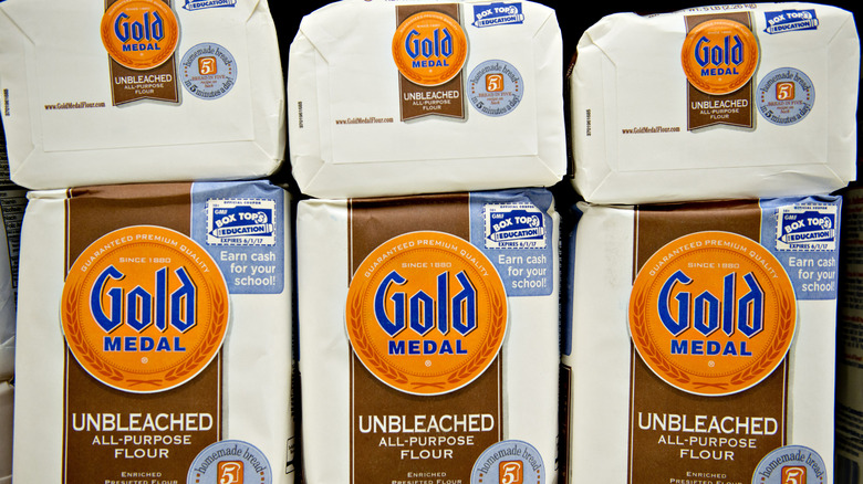Spring-cleaning the pantry might need to come a little earlier due to a recent announcement from General Mills. Under guidance from the Food and Drug Administration, Gold Medal has voluntarily recalled select offerings of its unbleached and bleached all-purpose flour. The nationwide decision impacts bags of 2-lb, 5-lb, and 10-lb flours that have a best by date of March 27, 2024, and March 28, 2024. The voluntary recall comes in response to potential salmonella contamination. Although General Mills said in an April 28 statement (via Food Business News) that Salmonella Infantis "is killed by heat through baking, frying, sautéing, or boiling products made with flour," that scenario does not protect against other instances where raw flour can come into contact with surfaces, utensils, or hands. Consumers are urged to stop using and dispose of the potentially contaminated flour products.