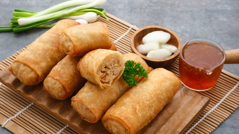 Egg rolls are unique but also not. They are very similar to the spring roll and often get compared or confused with one another. What's the difference between spring rolls and egg rolls? Well, it can depend on who you ask. Mental Floss says the easiest way to tell the difference is the shell; the outlet states that if it resembles a deep-fried flour tortilla, you're likely dealing with an egg roll. That thickness creates another important distinction, says Izzy Cooking. Egg roll fillings are pre-cooked, while spring roll fillings, usually wrapped in a thin rice paper before frying, are not. The thin coating allows the filling to cook during the fry.
