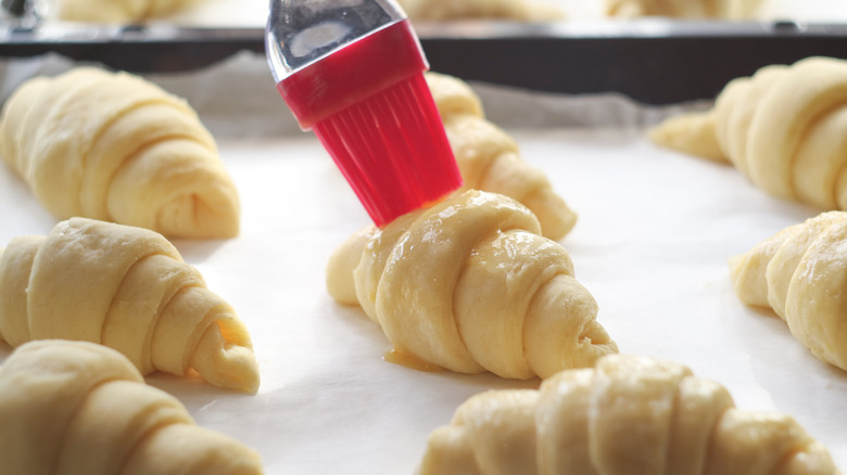 When using honey as a replacement for egg wash, first thin out the honey so that it can easily be brushed onto the surface of your pastry, scone, or bread dough in an even layer. The honey acts as a finishing glaze, so it shouldn't be too thick, crystallized, or gooey. If necessary, thin out your honey by microwaving it in a microwave-safe bowl for about 30 seconds, checking it at 15-second intervals, or melt your honey over low heat in a saucepan. Once it's in liquid form, mix 1 tablespoon of honey with 2 tablespoons of water, milk, or a plant-based milk alternative — such as almond milk or soy milk — and whisk to combine. For a sweeter glaze, increase the ratio of honey to liquid in your wash.