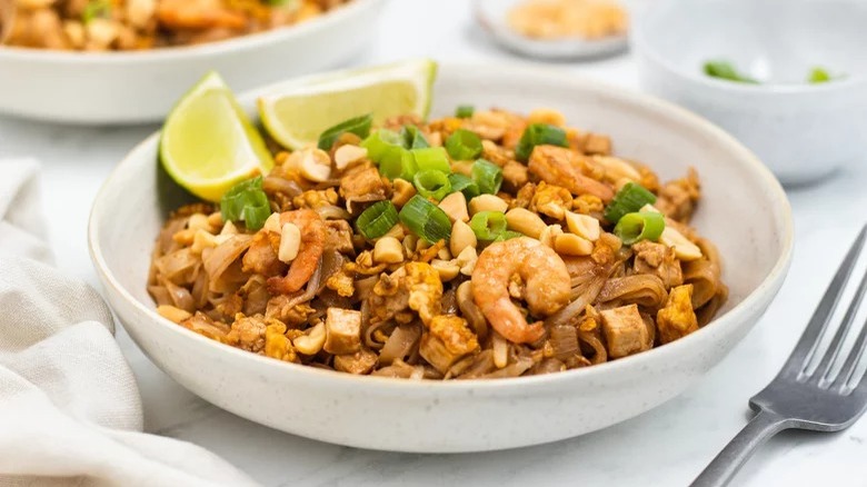 Along with shrimp, this dish also calls for firm tofu. Chopped peanuts and spring onions amplify the dish while also pulling double duty as aesthetically-pleasing garnishes, and lime wedges ensure a bright and tangy finish if you're in the mood for a citrus-based spritz.