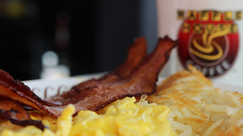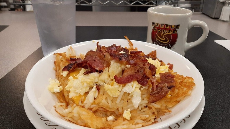 Waffle House offers a variety of hash brown bowls featuring bacon, sausage, or ham. The bacon egg & cheese hash brown bowl is a combination of carbohydrates and sodium that you're better off without. This bowl combines large hash browns, slices of bacon, two scrambled eggs, and two slices of American cheese.