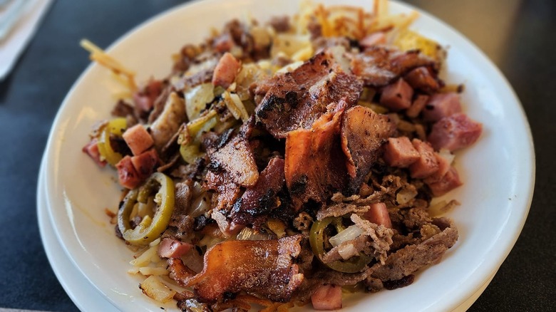 If you'd rather have your cheesesteak with eggs and hash browns rather than toast, Waffle House offers the Cheesesteak Melt and Chicken Melt hash brown bowls. Eating your cheesesteak a different way doesn't do anything to make it a healthier option for your food intake. While the other bowls are morning specialties, people opt for the Cheesesteak Melt hash brown bowl when it's time to order dinner. This meal features a double serving of hash browns, strips of sliced steak, grilled onions, and slices of American cheese.