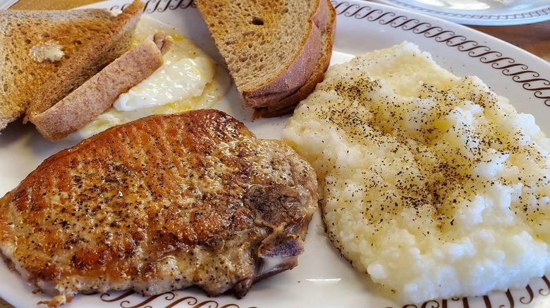 Aside from the porkchop, the dinner comes with the choice of a bread item, plus a side of grits, hash browns, or sliced tomatoes. White or wheat toast adds another 230 or 220 calories respectively. White toast has 370 milligrams of sodium and 26 grams of carbs, while wheat toast has 330 milligrams of sodium and 22 grams of carbs. Adding grits delivers another 90 calories and 300 milligrams of sodium, while hash browns deliver 190 calories and 240 milligrams of sodium. No matter how you combine your meal, a pork chop dinner is unhealthy and best left unordered.