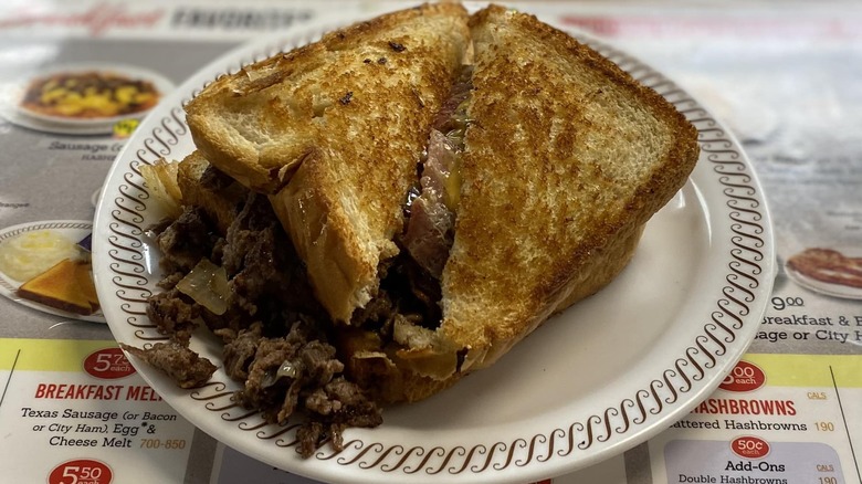 Waffle House is predominantly a Southern restaurant, both in terms of style and geography. However, it doesn't stop the chain from offering its own take on the cheesesteak. This comes in the form of the Texas Cheesesteak Melt, which consists of grilled meat, cheese, peppers, and melted cheese on buttered and toasted bread. If that sounds delicious to you, it doesn't come without a toll on your health.