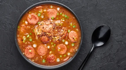 Gumbo is a stew or soup dish served with rice