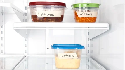 Once the food has cooled, place it in an airtight container or a plastic bag that's suitable for the fridge or freezer. Make sure to label the container with the name of the food and the date it was cooked so that you can determine if your leftovers are still good to eat. Store the container in the fridge or freezer as soon as possible. Be sure to place it on a shelf, and not in the door, as the inside of the fridge door sees more outside air, and therefore it has the most temperature fluctuations.
