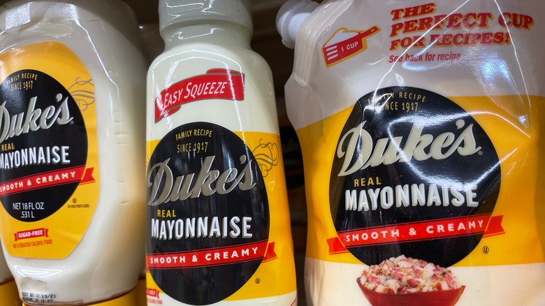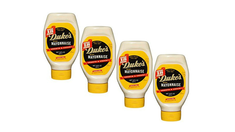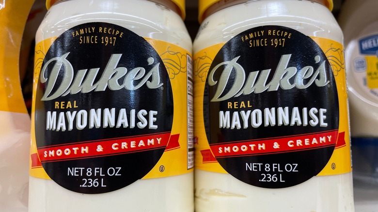 Most Southerners could recognize a jar of Duke's from a mile away by the bold, cursive script on the egg yolk-yellow label. Most will have strong opinions about the condiment, with those voices who shout that Duke's is the superior mayonnaise on store shelves ringing the loudest. You'll find nary a southern spread for a picnic, barbecue, or holiday that doesn't include Duke's in some capacity, whether it's in the pimento cheese, cucumber salad, or chocolate cake (yes, chocolate cake — we'll get to that in a minute).