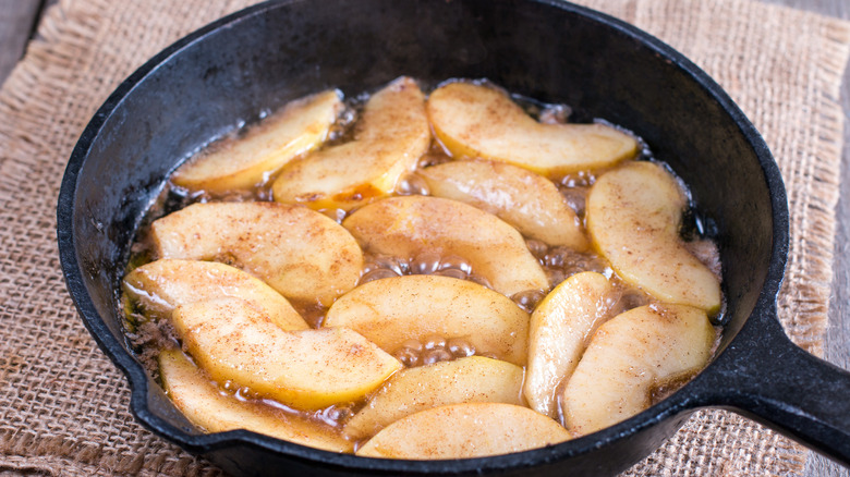 You can use any apple you have, but somewhat firm varieties (such as granny smith or honey crisp) are solid options. These apples work better because they're not so delicate that they turn mushy when you cook them. This way, they still hold their shape and have a uniform look. Finally, when you make this topping, plan to serve it immediately to enjoy it before it cools. Although this topping has warm flavors and reminds you of autumn, it is suitable for any time of year — and its texture pairs perfectly with the tender crepes.