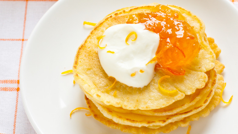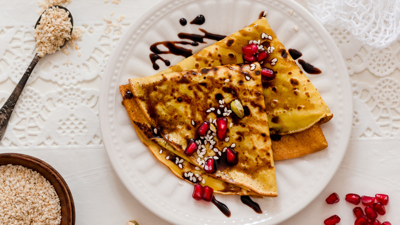 You can also use a small scoop of the crème fraîche without spreading it out. Moreover, berry crepes aren't the only option. This garnish works with other kinds, like chocolate crepe recipes which take advantage of whole, freshly grated nutmeg. If you can get fresh stuff, it's undoubtedly more robust than pre-ground nutmeg. Use a cheese grater or citrus zester to break it down. Nutmeg's warm, woody aroma will make you want to dig right into the crepe — so don't skip out on it when you use crème fraîche.