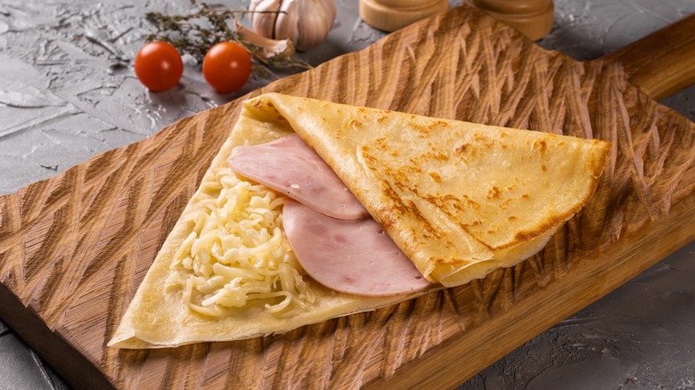 Like many other options listed, white cheddar cheese is versatile and has flavorful attributes that shine when you place it on a crepe. It also has a different look than its yellow counterpart, which contains annatto, a food coloring agent. You can use this cheddar to make a rich cheese sauce, creating a gorgeous blanket to cover your crepe. White cheddar sauce is easy to make, too, because you can add cheese to a pleasantly buttery bechamel sauce. Then, enjoy the crepes and sauce while they are still warm for the best experience possible.