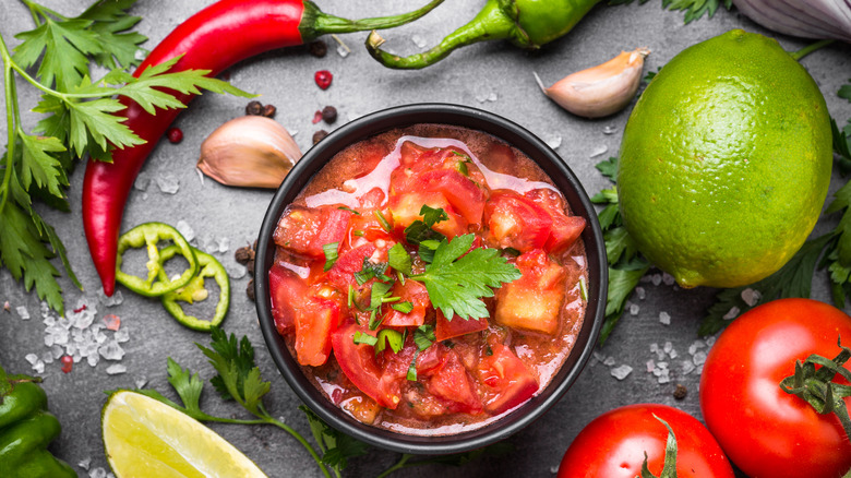 There are a few ways to use both salsa and cream cheese simultaneously as toppings for your crepes. These two elements are a match made in heaven because the salsa is spicy and chunky, while the cream cheese is oh-so-silky. So, when you apply both, you first notice the heat from the salsa, and then the cream cheese calms the palate with its milky qualities. Moreover, if you keep the elements separate, the salsa is vivid, which contrasts with the light cream cheese. In fact, you should avoid mixing them because it creates a pinkish color that isn't nearly as appetizing.