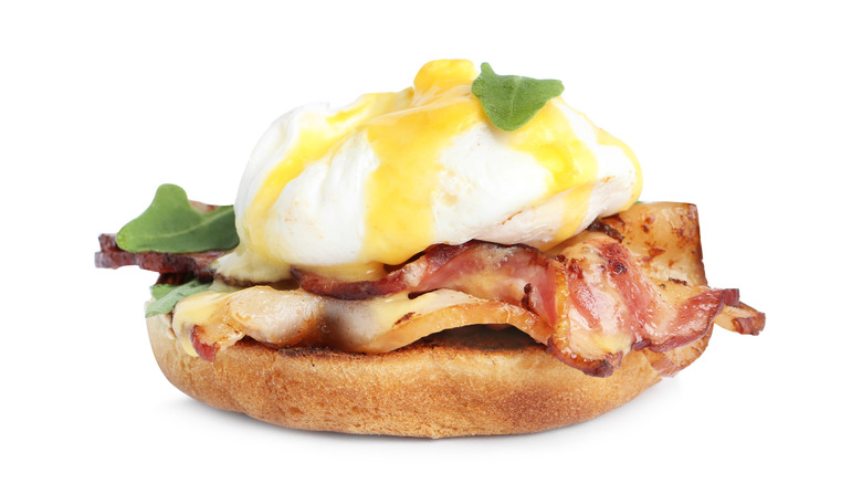 Step into any restaurant serving Sunday Brunch and you are likely to come across at least one variation of Eggs Benedict on the menu. This rich and oh-so-satisfying dish is a favorite among weekend brunchers, in part because it's not the simplest dish to recreate at home. The main components of a classic Eggs Benedict include poached eggs over Canadian bacon and an English muffin, all of which comes covered in a generous drizzle of hollandaise sauce. It's a savory and filling meal that customers cannot seem to get enough of — but where did Eggs Benedict come from, exactly?