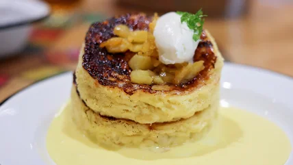 In a pan, separate from the French toast, Xiloj boils the sugar and water until they both form a deep brown, caramel-like substance, and then they simply dip both sides of their finished French toast into the hot mixture. Once the French toast cools, a candied crust forms — just like crème brûlée. With a satisfying back-of-the-spoon crack onto the sugary coating, something tells us this dish tastes as good as it looks.