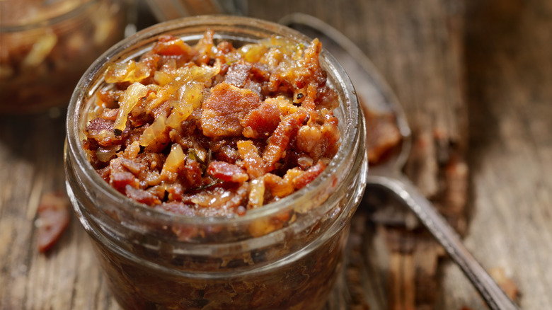 If you want to double down on the meaty elements of your charcuterie board — and we don't just mean adding all the best meats to your spread — then you can make a bacon onion jam. Yes, it's a thing, and it's as salty, sweet, and delicious as you can imagine. Candy the bacon and onion in maple syrup, or even add half a cup of bourbon to seriously jam those flavors together. This variety is excellent on mild cheeses with a slice of fresh apple. As you can tell, onion jam is the condiment you've been missing; it will seriously take your charcuterie board to the next level.
