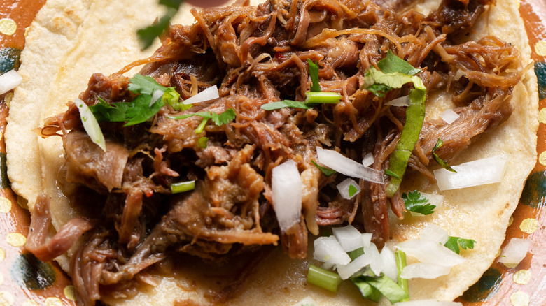 Part of the reason that Pueblo Viejo has become so popular is that its barbacoa tacos are out of this world — and they aren't like anything else you'll find at most other restaurants. At Pueblo Viejo's Pickle Road location, the barbacoa is prepared with lamb instead of beef, and the meat undergoes a unique culinary process that makes it extra succulent and flavorful. Here, the lamb is wrapped in agave leaves before being cooked on low heat for a full eight hours. The result is a fatty, juicy pile of lamb that is so soft it practically falls apart in your mouth.