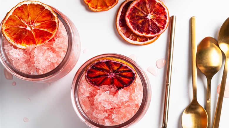The key here, though, is to adjust the ABV (alcohol by volume) since alcohol has a lower freezing temperature than water. To keep your drink from turning into soupy sludge, aim for about 10 to 15% ABV. Garnish the delicious drink with dried blood oranges to complement the blood orange syrup, or stick with the original recipe's suggestion of dried rose petals.
