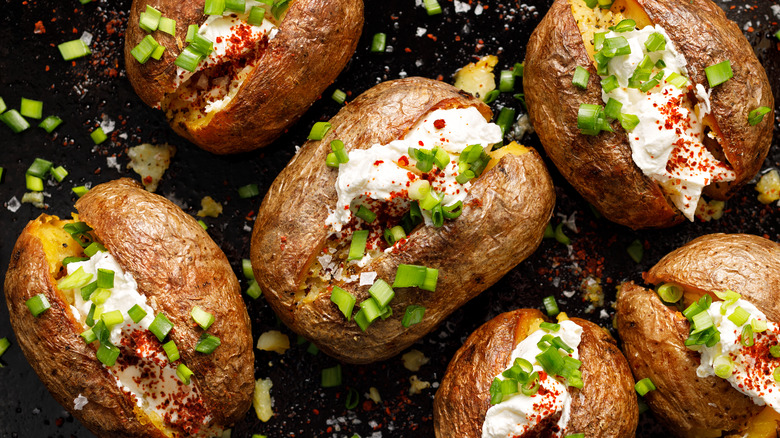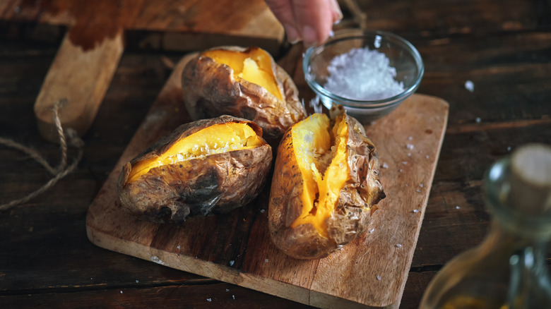 If old habits refuse to die, it's okay. We get it. You can still enjoy your potato without its olive-oil-infused, crackling skin. In this case, it might be better to halve your potatoes and season them on the fleshy side. That way, the water inside the potato won't be solely contained within. Plus, the spices will adhere better to the inside of the potato than the outside, especially with butter involved. In that case, it's recommended to stick with classic flavorings, like pepper or salt, which can ultimately make the baked potato fluffier.