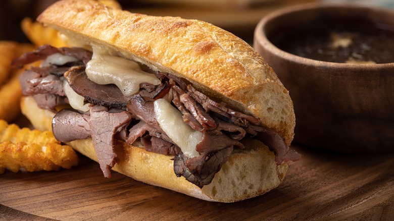 It's easy to assume French dip sandwiches are, well, French. There's the obvious fact that the word French is right there in the name, but the sandwich is also something you might imagine would be served at a bistro in Paris, mainly because the combination of ingredients are quintessentially French. Elevating straightforward flavors is a hallmark of French cuisine, and French dip sandwiches fit the bill. They're made with only four components — a baguette or French roll, roast beef, provolone cheese, and a light gravy referred to as au jus, which translates to "with juice" in French.