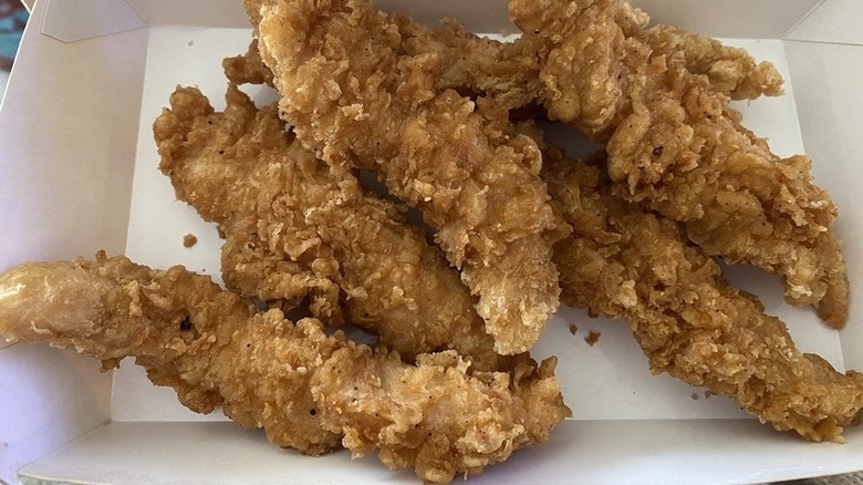 Aside from offering whole pieces, people also routinely order chicken tenders from Jollibee. They are deep-fried, hand-breaded pieces of white meat chicken that are crispy and seasoned. You may enjoy the taste of these tenders, but they're unhealthy when you consider the cholesterol and sodium content, and that they are fried.