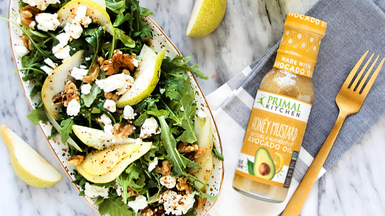 Olive and canola oil have their own benefits, but it's not every day we have the option to enjoy avocado. Avocado oil has a light, grassy taste that blends well in almost any dressing. Like olive oil, it's full of oleic acid, a heart-healthy monounsaturated fat. Also, avocado oils tend to have a higher smoke point. So if you plan to use your honey mustard dressing in a stir fry or baked glaze, Primal Kitchen's Honey Mustard Vinaigrette might be a better bet.